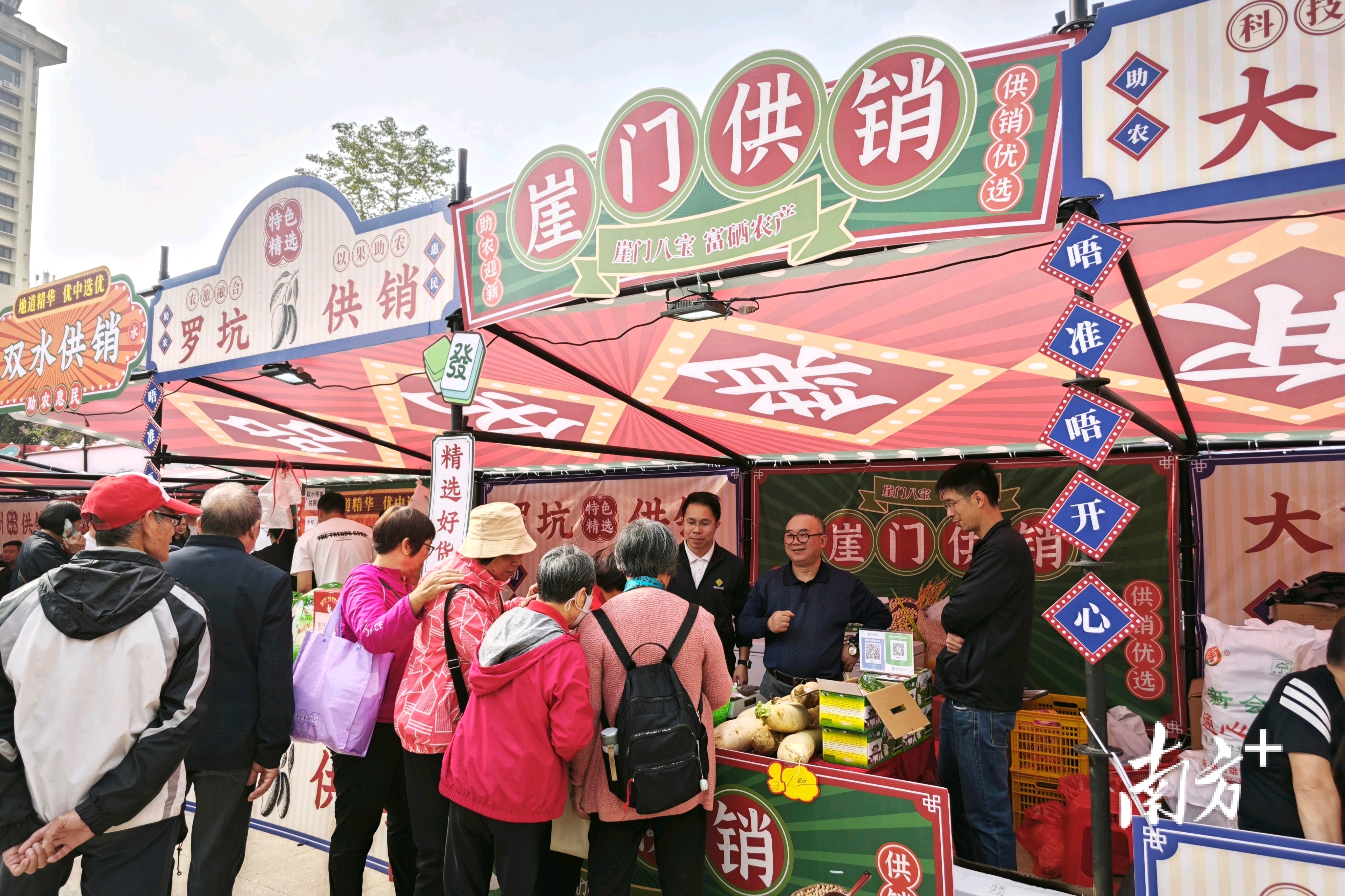 新会“时光市集”则成为假期另一道独特的风景线。市集汇聚江门各县(市、区)及周边地区30余家优质农产品供应商,现场各类农特产品琳琅满目,吸引众多市民驻足选购。展区还复原了上世纪八九十年代供销社的经典场景——老式自行车、复古电视机、怀旧缝纫机等元素与“供销直供”风格的广告牌相映成趣,营造出浓郁的怀旧氛围,唤起不少市民的亲切记忆。