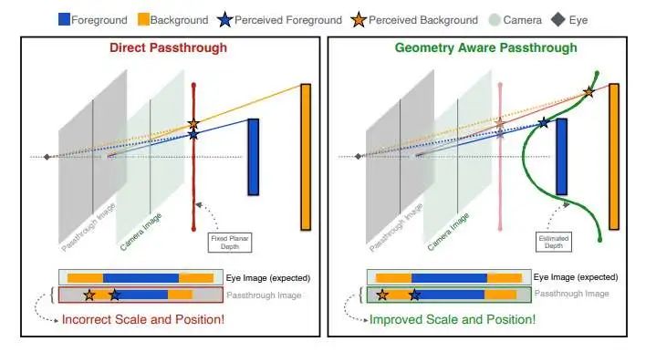 在VST头显中,由于硬件和物理的限制,摄像头通常位于头显的外表面,远离用户的眼睛位置。直接透视,即将原始摄像头馈送到显示器,会放大距离,从而放大物体的运动。根据感觉冲突理论,视觉和惯性信号之间的不匹配可能会导致不适。